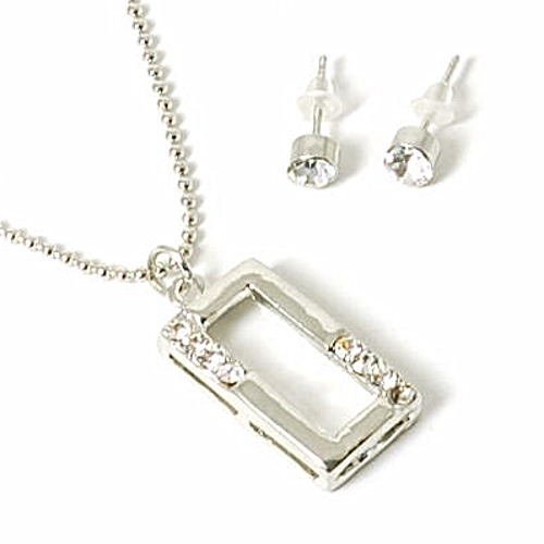 la Olivia Collection présente ce nouvel ensemble qui va rencontrer un grand succès! Il est composé de petites boucles doreilles clous de 5mm en forme de solitaires, serties de cristaux qui attrapent la lumière et dun pendentif en forme de rectangle ouvert. Le pendentif mesure seulement 2.5cm mais il est serti de 4 zirconiums cubiques scintillants, de chaque côté, qui donneront une touche de brillance à tout ce que vous porterez! Il est accompagné dune chaine de boules de 43cm avec 8cm dextension possibles pour le porter plus bas si vous le souhaitez! Vous pouvez en faire un cadeau qui sera très apprécié ou bien lacheter pour vous-même!!. 1