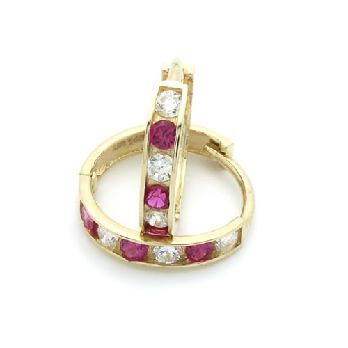 14K Yellow Gold Huggie Hoop Earrings 2mm, 12mm Diameter Channel Set White & Red CZ For Kids & Teens